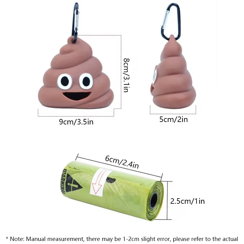 Size: Pet stool dispenser: 8cm in height, 9cm at the widest point; Fecal bag: A single piece is 6cm long, 2.5cm in diameter, and the unfolded size of a single garbage bag is 31x23cm
